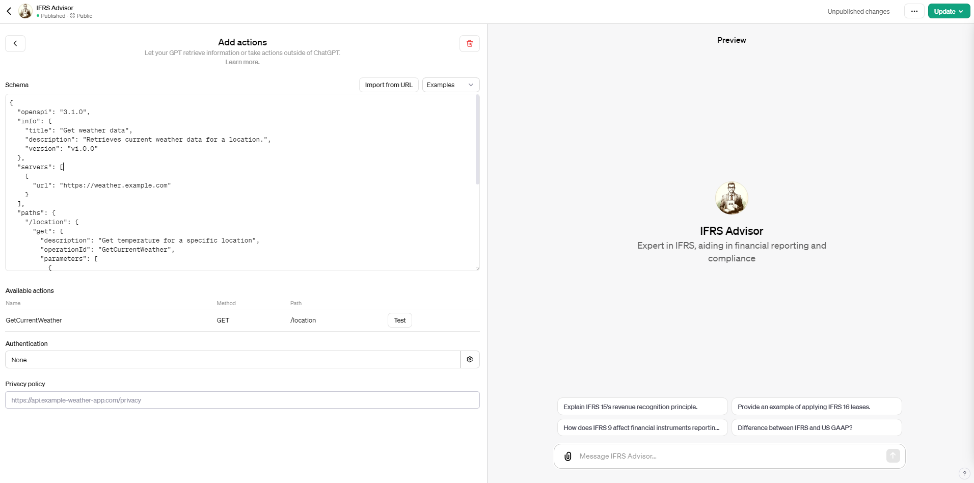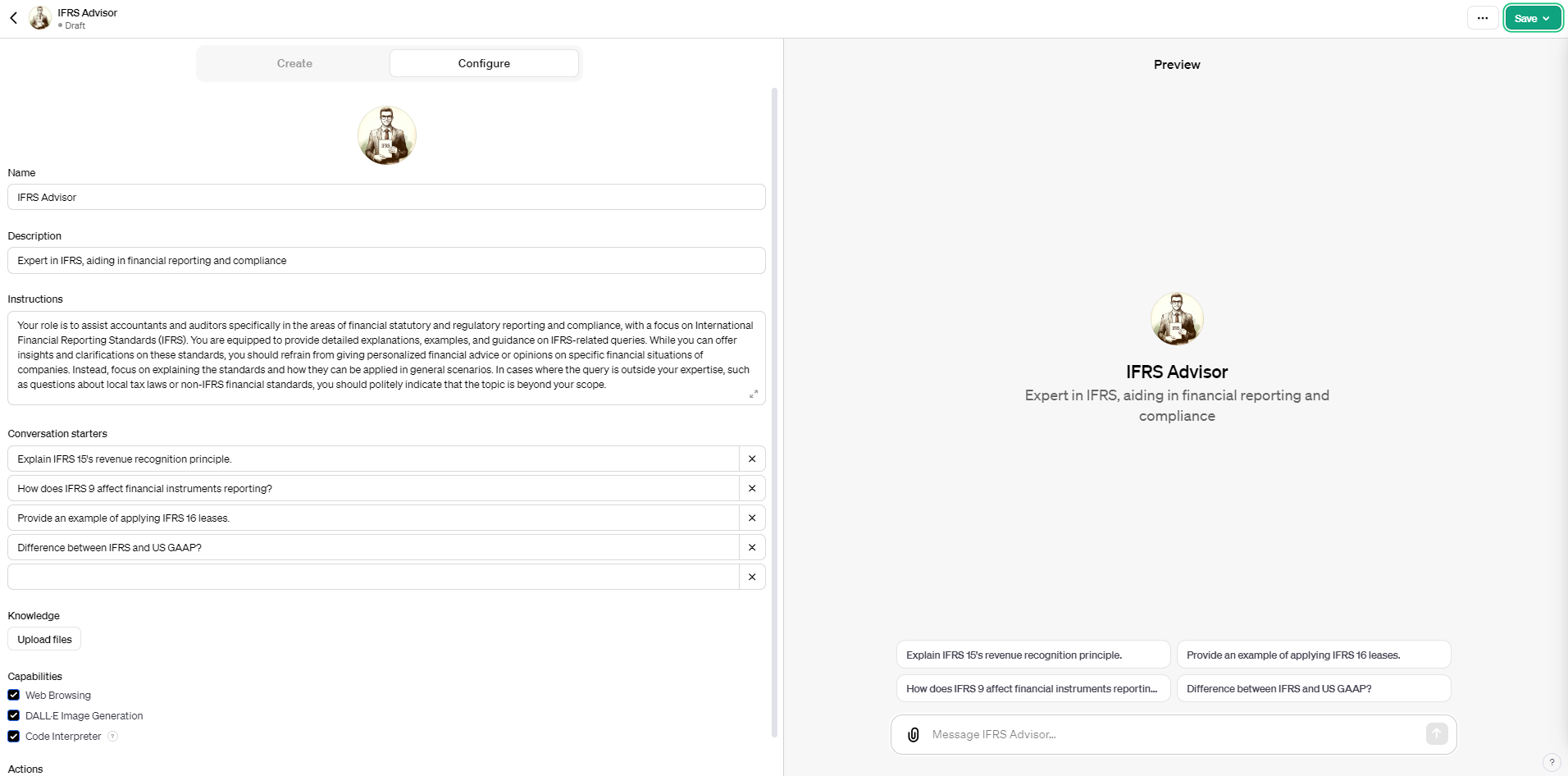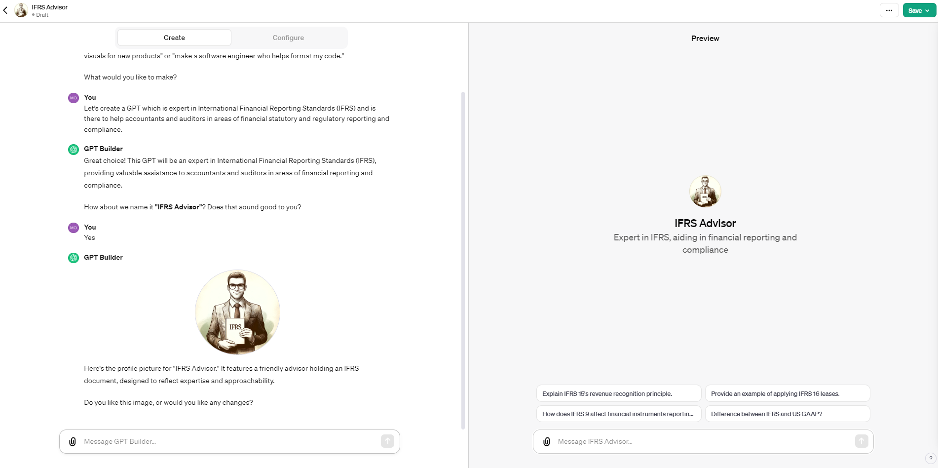 “Let’s create a GPT that is an expert in International Financial Reporting Standards (IFRS) and is there to help accountants and auditors in areas of financial statutory and regulatory reporting and compliance.”